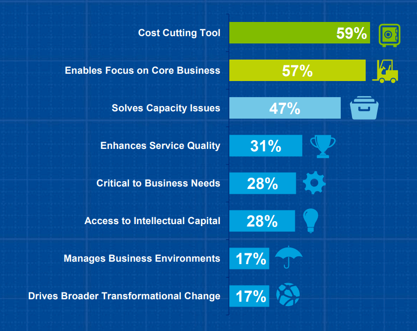 In a recent Deloitte global survey on outsourcing, it was found that the top two reasons for outsourcing are reducing costs and focusing on the core business.